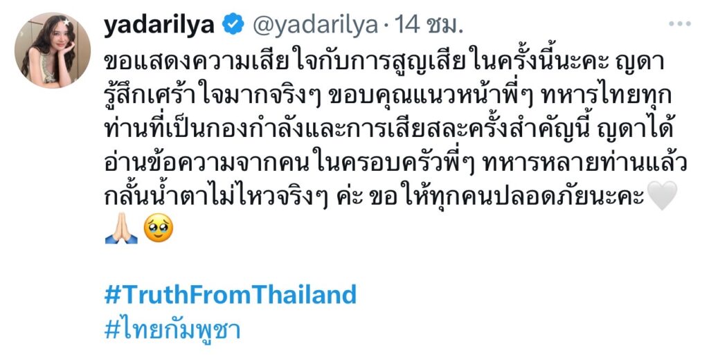 ฉันต้องการแสดงความเสียใจเกี่ยวกับการสูญเสียนี้ ชฎาเศร้ามาก ขอบคุณสำหรับด้านหน้า ทหารไทยทุกคนที่เป็นกองกำลังที่สำคัญที่สุดและผู้ที่ตกเป็นเหยื่อของ Yada เป็นข้อความจากสมาชิกในครอบครัว ทหารหลายคนฉันไม่สามารถน้ำตาได้ ฉันขอให้ทุกคนปลอดภัย