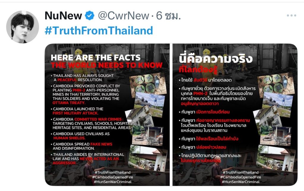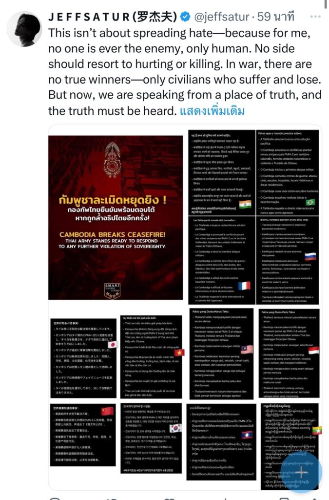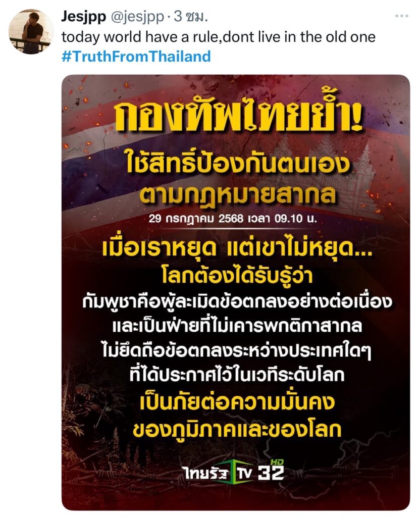 ชื่อ #truthfromthailand ซึ่งยังคงรีบไปถึงแนวโน้มของ X หมายเลข 1 เพราะกองทัพไทย -วอลล์คเชิญชวนให้คุณเข้าร่วมแคมเปญ #Truthfromthailand คุณส่งข้อมูลความจริงไปยังผู้คนทั่วโลกที่กัมพูชาโจมตีทีมไทยเป็นครั้งแรก แต่โกหกเป็นเหยื่อและในเวลาเดียวกันเผยแพร่ข้อความปลอมข้อเท็จจริงจะถูกบิดเบือนโดยด้านที่ไซต์ของเราด้อยโอกาส แม้ว่ากัมพูชาจะโจมตีประเทศไทยเป็นครั้งแรก